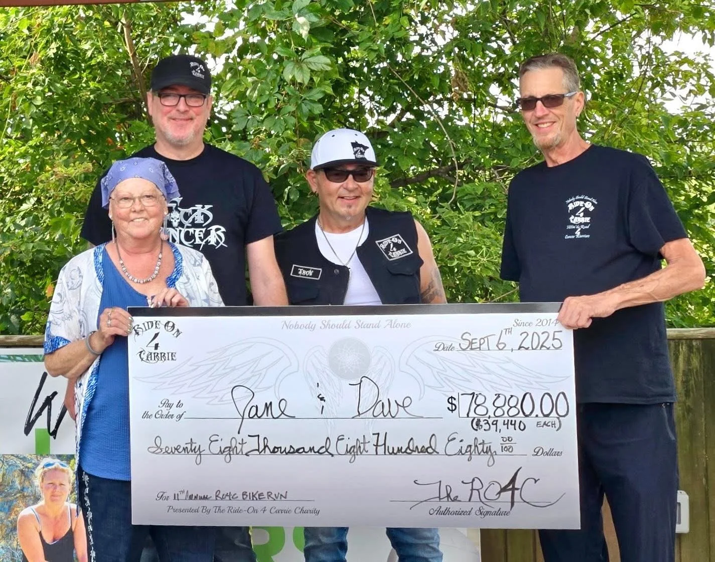 The RO4C was able to overcome last weekends weather obstacles for what turned out to be our most successful event to date ~ Proving once again that it’ll take more than cold temps and a little rain to slow down not only the dedicated RO4C volunteers, but also the legion of wonderful RO4C riders and supporters that stood with us this year, as they always do … With the RO4C’s hard work, and that overwhelming community support, we are truly humbled to be able to present our check for $78,880 to Dave and Jane’s families ~ With that, each recipient will receive $39,440 to assist they and their families… Thank you to all that attended ~ All that donated ~ And especially, to each of the hard working RO4C Crew for putting on another amazing event ~ ‘Nobody Should Stand Alone’